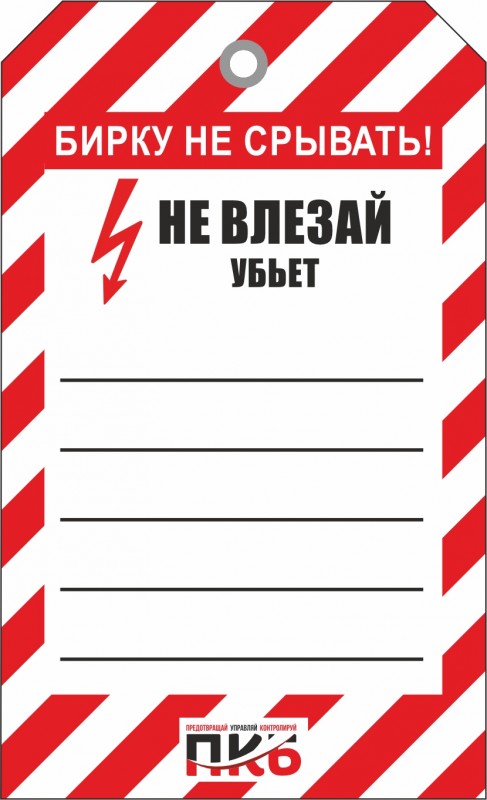 Информационная бирка "Не влезай, убьёт!", арт. PKBS87, односторонняя. Изготовлена из пластика, толщиной 0,3 мм, без люверса, Ø отверстия 7 мм. По желании заказчика толщина бирки может быть увеличена до 1-2 мм. Нанесение текста можно производить маркером или ручкой. Размер 70 х 115 х 0,3мм.