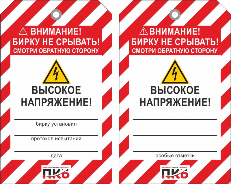 Информационная бирка "Высокое напряжение", арт. PKBS107, двусторонняя. Изготовлена из пластика, толщиной 0,3 мм, без люверса, Ø отверстия 7 мм. По желании заказчика толщина бирки может быть увеличена до 1-2 мм. Нанесение текста можно производить маркером или ручкой. Размер 70 х 115 х 0,3мм.